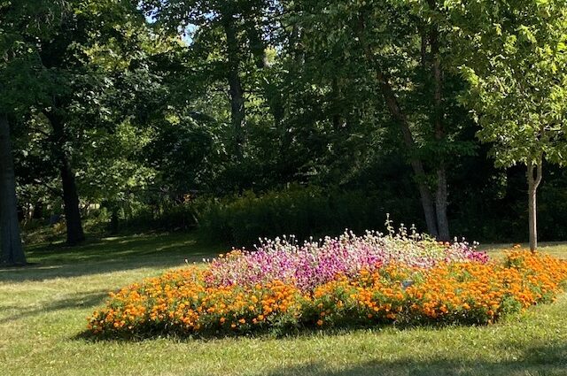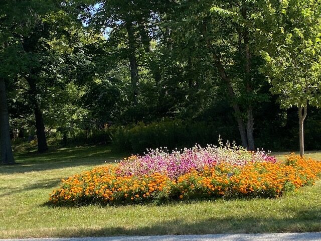 The left picture shows a shady spot we call Mary’s Tree. The berm is filled with daffodils and in 2024 Project GREEN volunteers planted two varieties of Walker’s Low Nepeta Catmint, pink and blue. This bed now requires watering and mulching only. Proven Winners when asked the difference between catmint and catnip states, “Both are part of the mint family and both belong to the Nepeta genus. But Catnip is Nepeta cataria and Catmint is Nepeta mussinii. Catnip has a weedier appearance and an insignificant white flower, while Catmint is often used as a pretty, lavender flowering perennial in beds.” Good to know! Thanks to Pat Yeggy for the labels telling of Project GREEN’s catmint. The beautiful garden bed on the right is the Quilt. This bed is found along the hiking/biking trail close to the Park Road sidewalk. The frame of the quilt is tangerine marigolds and the center many-colored Globe Amaranth, “Gomphrena globosa.” In the past the Quilt had gorgeous coleus in its center. Unfortunately the coleus needed “pinching” to control its height and make bushier. With so many bees amongst the marigolds and coleus it was too challenging for volunteers to care for the coleus. The amaranth needs no extra care except water and sun. Perfect for our Quilt!