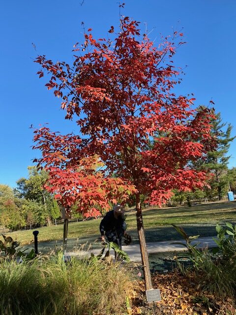 Max’s tree is a special one, called a Three-flowered Maple, Acer Triflorum. Ed Rinderspacher, our Project Green manager, chose this tree and planted it in 2022. Look at it’s very straight trunk and beautiful autumn colors! The Missouri Botanical Garden describes this tree as, “Acer triflorum is commonly known as three-flowered maple. It is a small, deciduous understory tree which typically grows 25-30′ tall with a densely-branched, rounded crown. Best ornamental features are its attractive shape, exfoliating bark and fall color. Medium green trifoliate leaves (leaflets to 3″ long) turn vibrant shades of orange to red in autumn. Ash-brown bark exfoliates in vertical strips to reveal orange-brown inner bark. Greenish-yellow flowers appear in April in clusters of three, hence the species and common names. As with most maples, the flowers are not showy. Fruit is a samara (1-1.25″ long). Similar in appearance and habit to paperbark maple, Acer griseum. (Genus name is the Latin name for a maple tree. Specific epithet means three-flowered in reference to the flowers, which are in clusters of three.”)