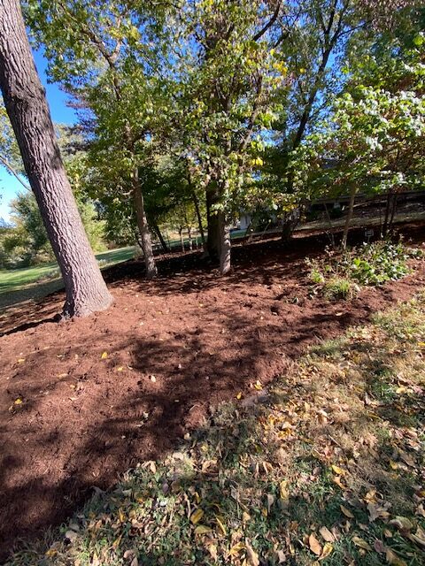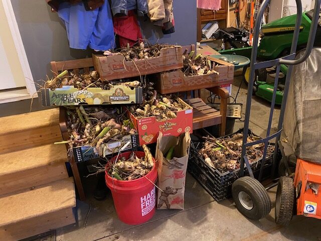 Our to-do list was a busy one. Mulch was moved from the parking lot to West Oval 1 using Ed R’s dingo and gator, mulch was spread evenly over the Oval, the Arch, and Ligularia dell, canna lilies and elephant ears were dug and placed on tarps. Sue Mullins collected the rhizomes and bulbs, putting them in her truck and transported them to Diane Allen’s home. They will be placed in boxes and settled into a heated (40 degree) well house for over-wintering. See pictures below showing some of week 25’s accomplishments: